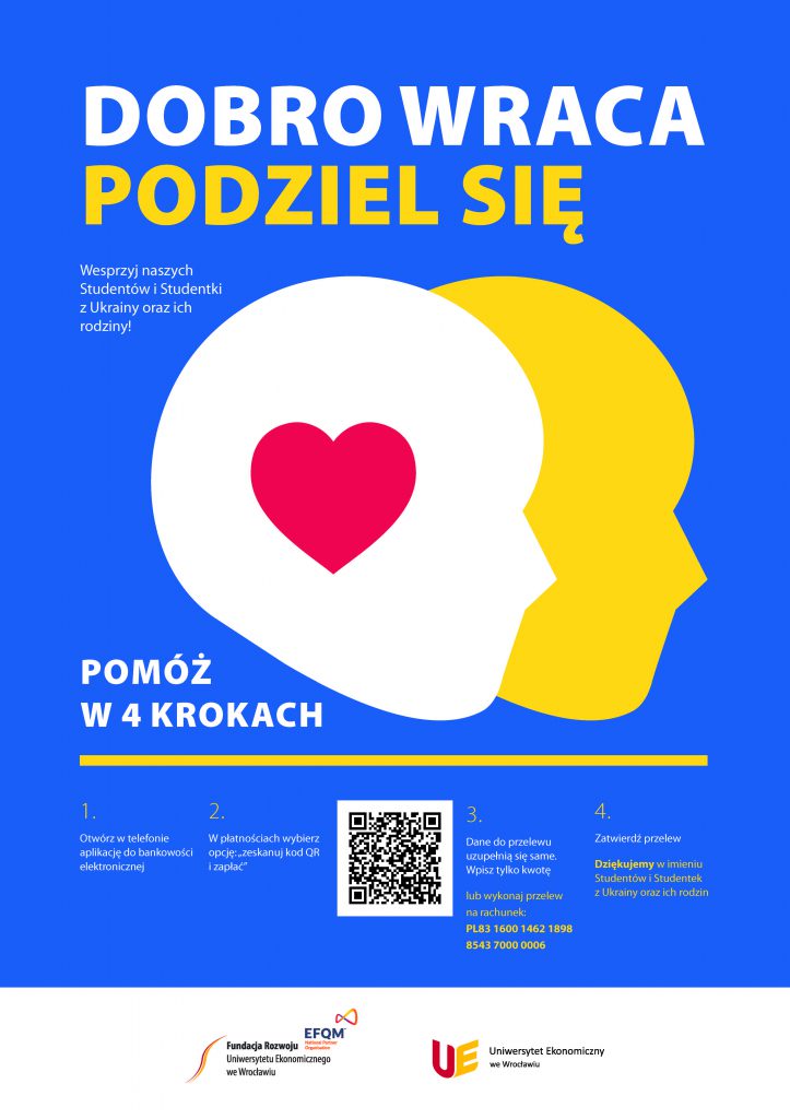 Nasz Uniwersytet ma wielu przyjaciół, którzy z pewnością do nas dołączą. W naszym uniwersytecie studiuje ponad 200 studentów z Ukrainy, stanowiąc istotną część naszej społeczności akademickiej. Wielu z nich obecnie znajduje się w ekstremalnie trudnej sytuacji. Najbardziej możemy pomóc, łącząc siły, dlatego Fundacja Rozwoju Uniwersytetu Ekonomicznego we Wrocławiu uruchomiła specjalną zbiórkę pieniędzy, która zostanie przeznaczona na najpilniejsze potrzeby zgłaszane przez naszych studentów i studentki z Ukrainy, między innymi na: Nie bądźmy obojętni na cierpienie i los doświadczonych agresją Rosji Ukraińców. Otwórzmy swoje serca. Fundacja Rozwoju Uniwersytetu Ekonomicznego we Wrocławiu