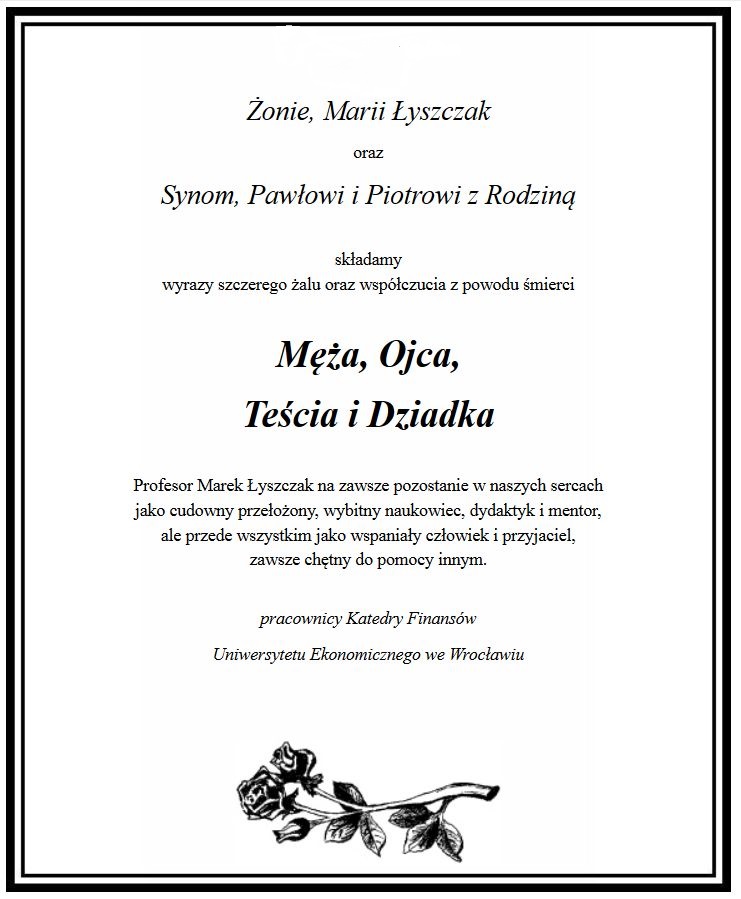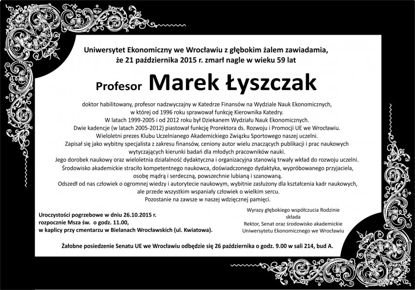 Żałobne posiedzenie Senatu Uniwersytetu Ekonomicznego we Wrocławiu odbędzie się 26 października 2015 roku o godz. 9:00 w sali 214, bud A.